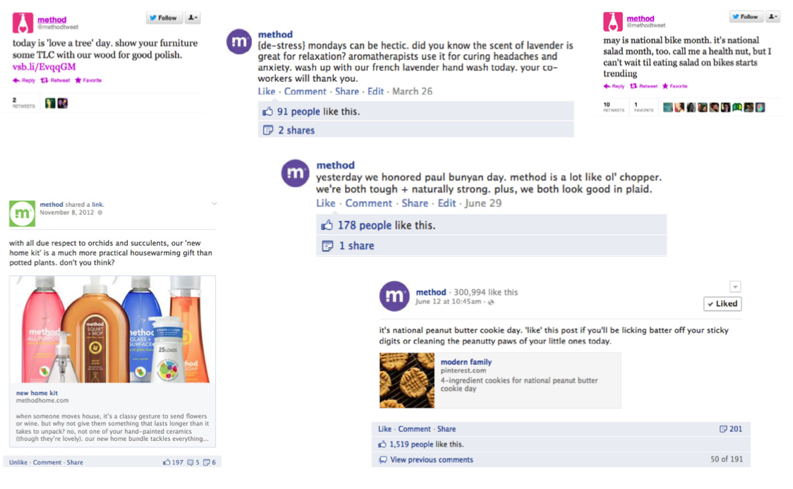 In 2012, Method asked Mekanism to add a little more oomph to their Facebook updates and tweets. Besides creating content, we also strategized for consumer social engagement acivations such as giveaway and contest every month around their product category focuses. We increased the brand pages’ fans by 13% in five months. I also supplied 90 out of 100 pins with SEO captions on their holiday Pinterest board that year.